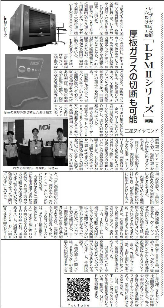お知らせ 新聞記事掲載のお知らせ(ガラス新聞) 2021.08.06 2021年7月26日発行のガラス新聞に、当社の記事が掲載されました。 ガラス新聞21年7月26日号 関連ページ ■ お知らせ – 【新製品発表】レーザガラス異形・穴あけ加工装置 ■ MDI公式Youtubeチャンネル 【論文掲載】中赤外 Er:ZBLAN ファイバレーザ... くるみん☆(2021年)の認定を受けました
