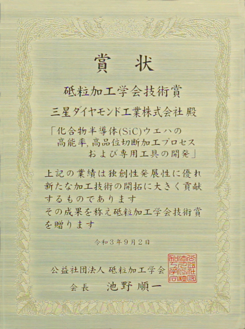 三星ダイヤモンド工業株式会社は、砥粒加工学会より技術賞を受賞いたしました。