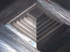 加工事例:ピラミッド頂点□1㎜への□0.1㎜賽の目加工 - 自社製治具+各種研削設備(平面、円筒、PG)での高精度微細研削技術